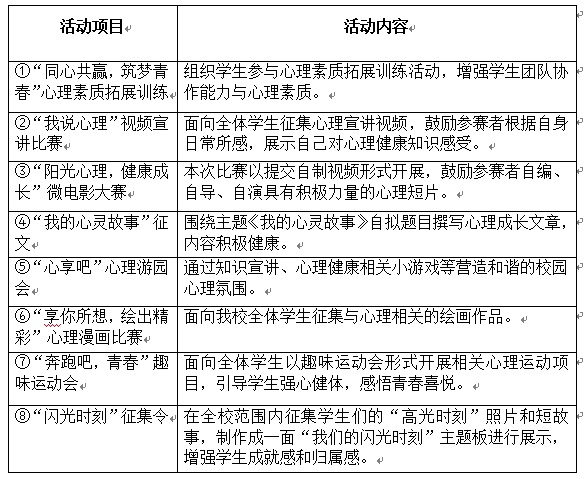 2.为保证心理健康教育周活动的多样性,各院部活动项目不能相同;如有相同,按照上报时间先后决定。